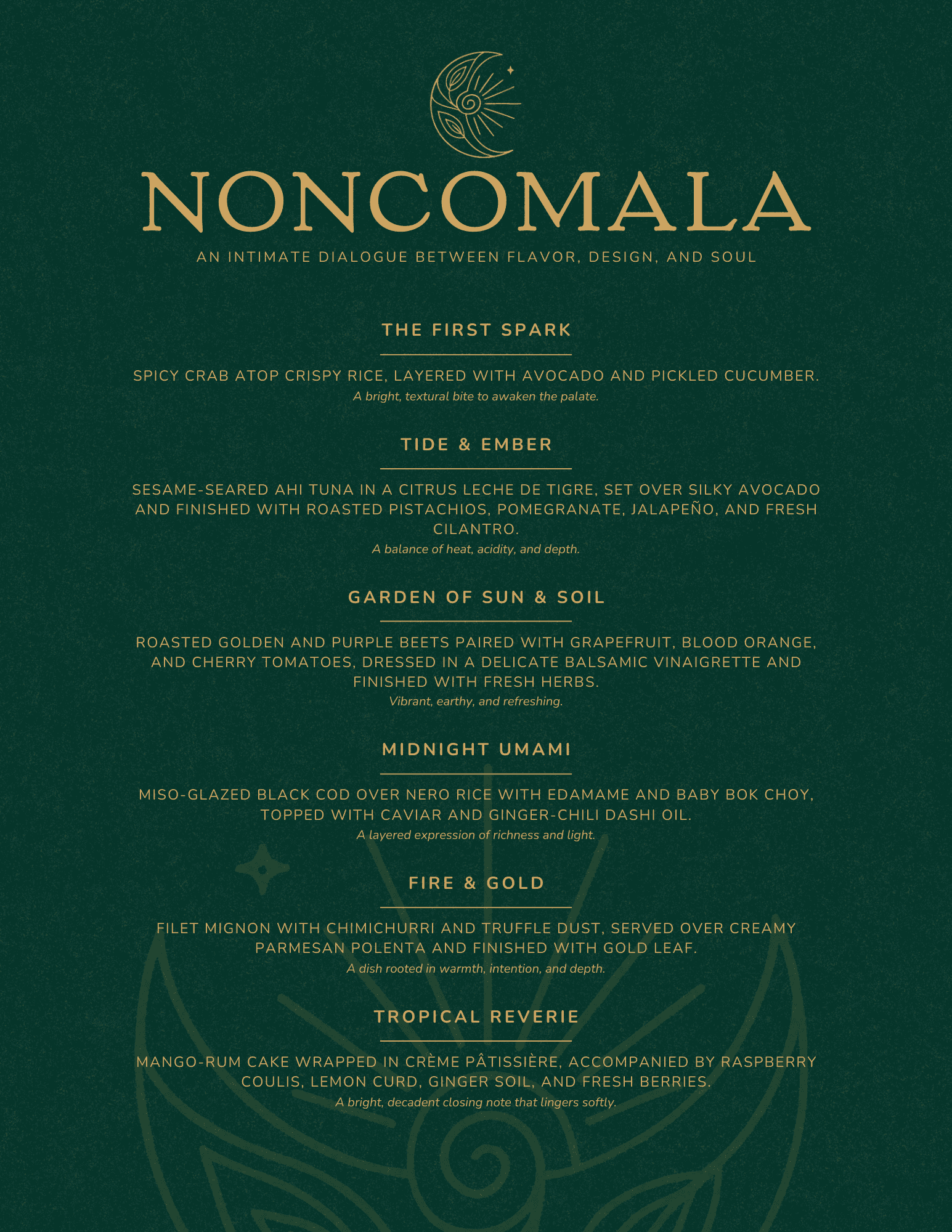 Every detail is considered. Plating, pacing, wine pairings, and sensory elements work together as part of a greater whole. Noncomala’s cuisine draws from many cultures, weaving flavor, memory, and artistry into a singular experience.